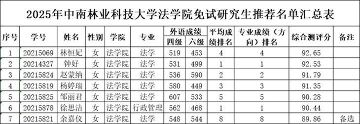 根据《中南林业科技大学推荐和接收优秀应届本科毕业生免试攻读硕士学位研究生实施办法》和《法学院2025年推荐优秀应届本科毕业生免试攻读硕士学位研究生工作方案》等文件规定,经个人申请,学院核查,专家组考核,拟推荐如下优秀应届本科毕业生免试攻读硕士学位研究生: