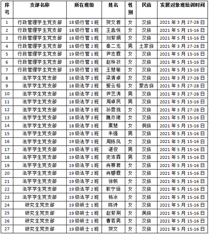 经各党支部教育、培养和考察,党内外群众了解,政治审查,学院党委预审,各党支部大会讨论、投票表决,拟接收贺文君等27位发展对象为中共预备党员,现将有关情况公示如下: