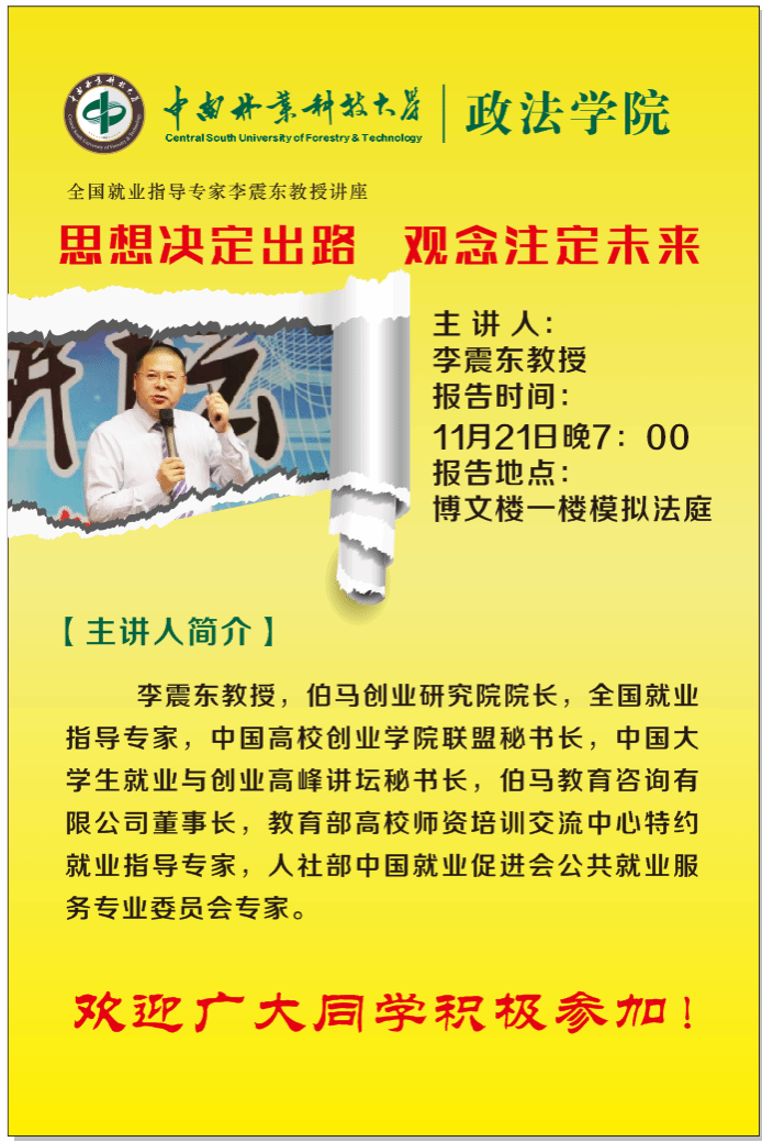 【主讲人简介】李震东教授,伯马创业研究院院长,全国就业指导专家,中国高校创新创业学院联盟秘书长,中国大学生就业与创业高峰讲坛秘书长,伯马教育咨询有限公司董事长,教育部高校师资培训交流中心特约就业指导专家,第三届中国互联网+大学生创新创业大赛专家评委,人社部中国就业促进会公共就业服务专业委员会专家,云南省教育厅创业指导专家,广西自治区教育厅就业指导专家,江西省教育厅创业指导专家,黑龙江省教育厅创业导师,山西省教育厅就业指导专家。