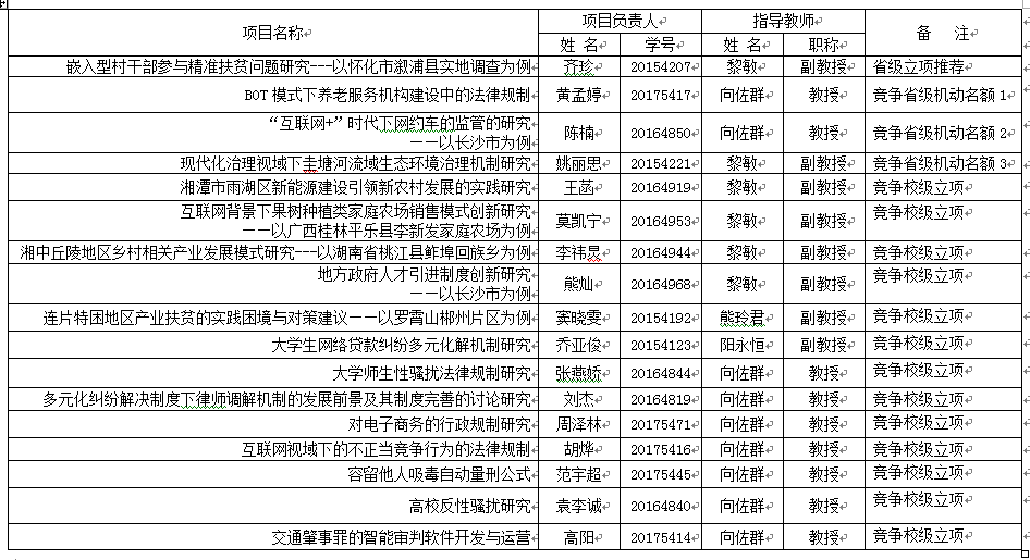 根据学校《关于报送2018年度学校大学生研究性学习和创新性实验计划项目的通知》的要求,经学生自主申报,学院组织专业教师审核评议,拟推荐《嵌入型村干部参与精准扶贫问题研究——以怀化市溆浦县实地调查为例》申报省级立项,拟推荐《BOT模式下养老服务机构建设中的法律规制》等3个项目申报省级机动名额(由学校根据各学院申报项目数量和质量结合专家评委意见推荐),拟推荐《湘潭市雨湖区新能源建设引领新农村发展的实践研究》等13个项目申报校级立项(由学校根据学院申报数量和质量结合专家评委意见推荐)。具体项目名单公示如下: