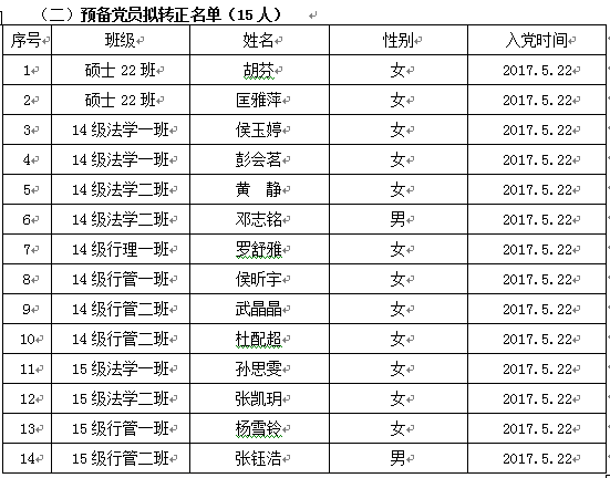 5月17日,学院党委会议对各支部上报的党员发展和预备党员转正名单进行审议,王碧莹等17名同学通过预审,拟发展为中共预备党员,拟将刘灿灿等15名同学转为中共正式党员。具体名单如下: