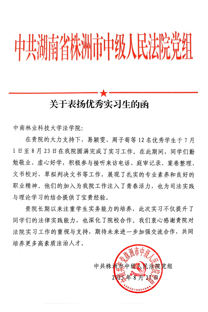 【法学院网讯】(文/黄娟)近日,我院收到株洲市中级人民法院党组发来的表扬函,表彰我院2023级法学专业易颖雯、周子荀、杨舒皓、王海冰、李过、王江涛、陈俐帆、张靖、张书源、张梓涵、刘礼慧、刘双等同学为优秀实习学生,高度赞扬了我院在实践教学中的高度重视和用心安排,肯定了我院学生的职业精神和实务能力。