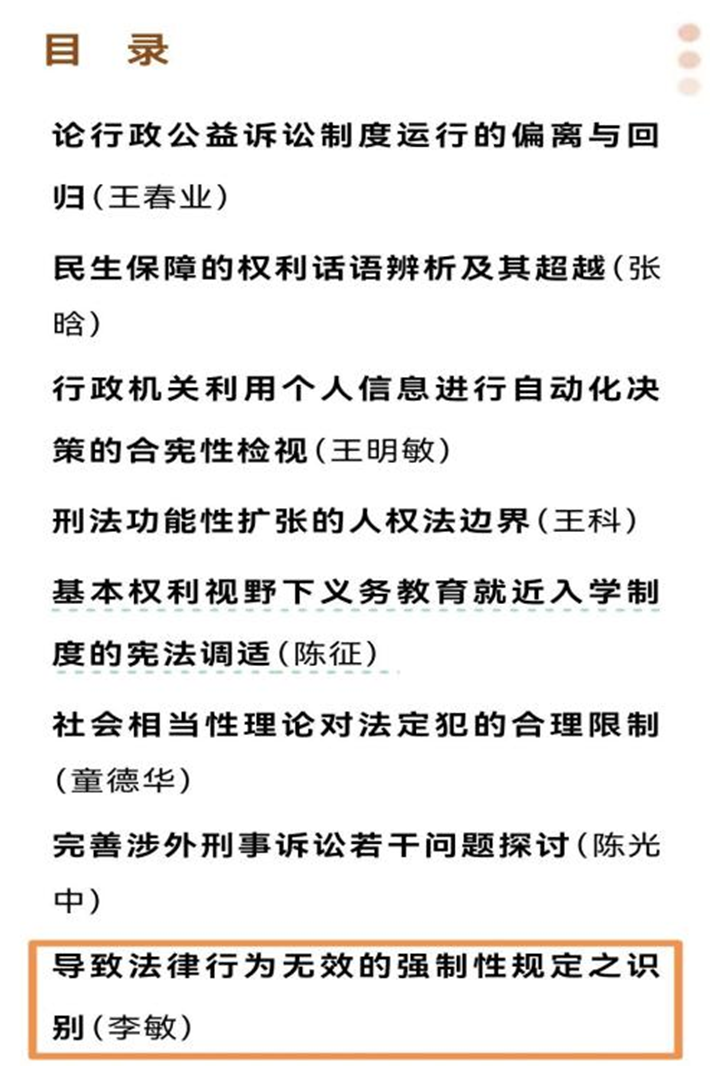 近日,院李敏教授在《法学》2025年第2期发表论文《导致法律行为无效的强制性规定之识别》。这是2025年首篇刊发的法核论文,《法学》为CLSCI来源期刊,也是我校遴选的重要期刊。