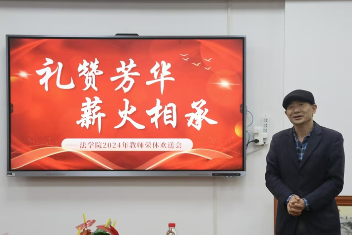 大会第六项,院长王飞跃总结发言。他首先以“三尺讲台,天下桃李”八个字对两位老师的坚守和杰出贡献进行概括,对两位老师进入新的人生阶段表示热烈的祝贺。接着以“相伴几载,一生不忘”。对两位老师对学院和师生无私奉献致以感谢。最后以“离岗不离家,传棒更传情”。希望荣休教职工退休不退志、离岗不离心,继续关心、关注和支持学校发展,为学院发展继续贡献力量;希望青年教职工向荣休教职工学习,传承和弘扬老一辈法学院教师爱岗敬业、追求卓越的精神品质,树立“躬耕教坛、强国有我”的志向和抱负;学校党委行政将创造条件为退休老师们办实事、办好事,为荣休教职工继续支持学校、学院工作、关心关爱下一代搭建桥梁。