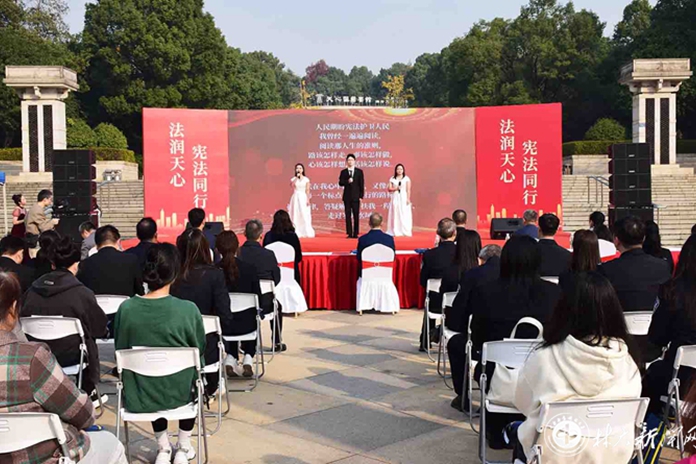 在第十一个国家宪法日来临之际,为大力弘扬宪法精神,推动学生学习宣传宪法,12月3日,学校与长沙市天心区司法局在湘府文化公园联合开展“法润天心·宪法同行”主题集中宣传活动。中共天心区委常委、政法委书记、区委依法治区办主任孙泉,天心区政府党组成员、副区长,区公安分局党委书记、局长刘海平,学校党委委员、宣传统战部部长方小斌出席活动。