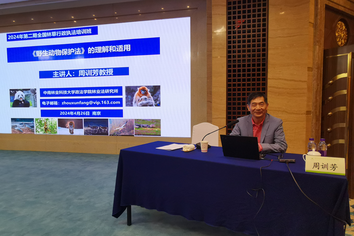应国家林草局管理干部学院邀请,周训芳教授于2024年4月26日在南京市作题为“《野生动物保护法》的理解和适用”的专题讲座。讲座由国家林草局管理干部学院蒋一主持,来自全国各地150名林草行政执法骨干听取了专题讲座。讲座中,周训芳教授就野生动物及其栖息地保护、野生动物管理、涉野生动物新型犯罪等野生动物保护的理论与实践问题进行了深入分析,为野生动物保护行政执法提供法学理论与法律实务指导。