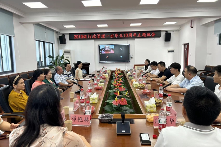 8月3日下午,在博文楼南1109,2010级行政管理一班部分校友重返母校召开“十载风华、友情如初、岁月如歌”主题班会,师生一起共叙情谊。一班班长徐文豹主持主题班会,分两个部分进行:1.返校校友追忆在中南林的四年时光和毕业十年的经历分享;2.未能返校的校友通过腾讯会议视频方式在线分享。校友们依次向学院报告了自己在校期间的趣事及毕业后的发展和经历,班会其乐融融,仿佛如初。