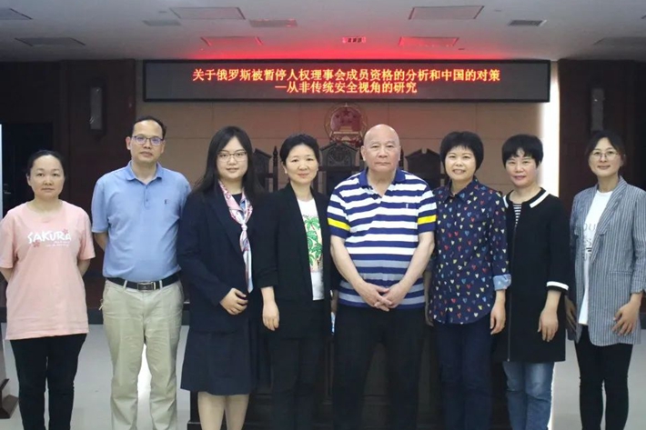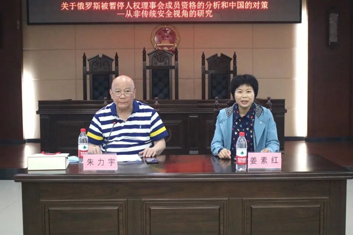 随后,讲座正式开始。朱力宇教授首先阐述了什么是“非传统安全”,并从五个方面展开论述了俄罗斯被暂停人权理事会成员资格的分析以及中国的对策。