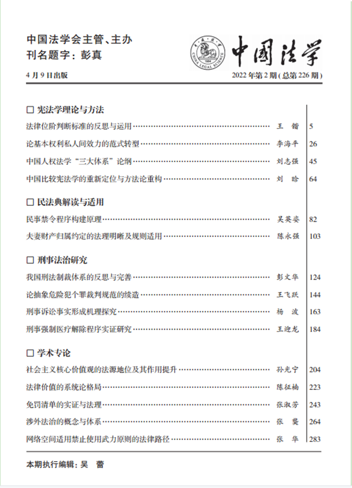 政法学院院长王飞跃教授在法学权威期刊《中国法学》2022年第2期刊发表论文《论抽象危险犯个罪裁判规范的续造》。这是中南林业科技大学第一篇在中国法学领域顶级期刊发表的原创性科研成果。