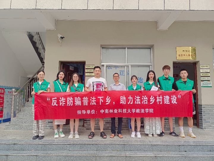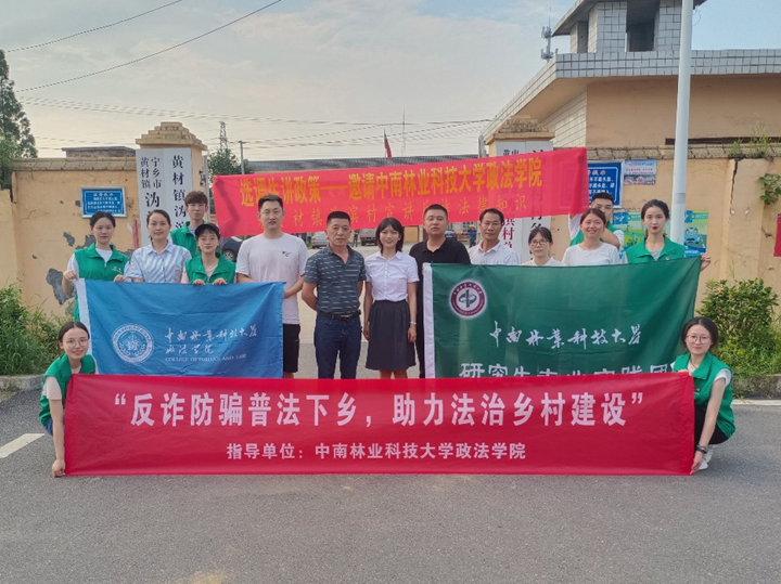 为实施乡村振兴战略提供安定有序的社会软环境、助力法治乡村建设、促进全民普法工作有效开展,今年七月,由中南林业科技大学政法学院老师指导带队、学院硕士研究生组成送法下乡实践团,围绕“反诈防骗”主题,面向宁乡市黄材镇沩滨村开展了一系列形式多样、内容丰富的普法宣传活动。
