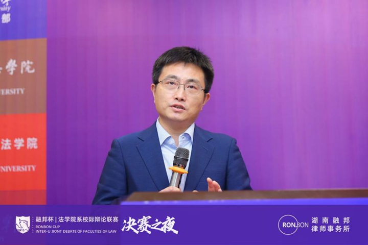 活动最后,由湖南融邦律师事务所主任严继光为本次联赛总结致辞,他表示很高兴能够现场见证四支参赛队伍的精彩表现,以及评委的精彩点评,这场活动的举办,得益于六所高校的无条件支持,得益于邓冰莹和徐天一两位评委无保留的指导,得益于在座学子的完美呈现,是一场高品质的辩论赛。