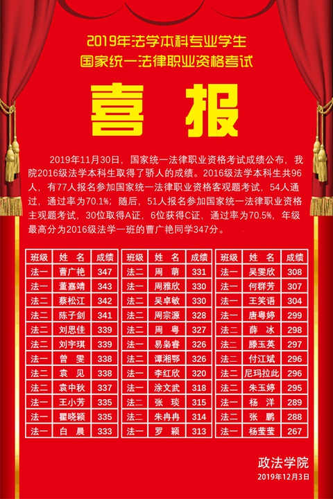 2019年11月30日,国家统一法律职业资格考试成绩公布,我院2016级法学本科生取得了骄人的成绩。2016级法学本科生共96人,其中有77人报名参加国家统一法律职业资格客观题考试,54人通过,通过率为70.1%;随后,51人报名参加国家统一法律职业资格主观题考试,其中30位取得A证,6位获得C证,通过率为70.5%。年级最高分为2016级法学一班的曹广艳同学347分。