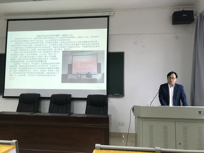 闫昌明书记首先向全体师生党员介绍了我院“不忘初心、牢记使命”的主题教育工作开展情况。然后结合前期主题教育工作,与大家一起分享和交流了自己的学习体会和感想,他强调,学院领导班子要带头做践行初心使命的奋斗者和做认真履职、矢志为民服务的践行者。要敢于担当、善于担当,认真履职,关注明生,着力解决教职员工和学生的操心事、烦心事,推动解决群众反映强烈的突出问题。