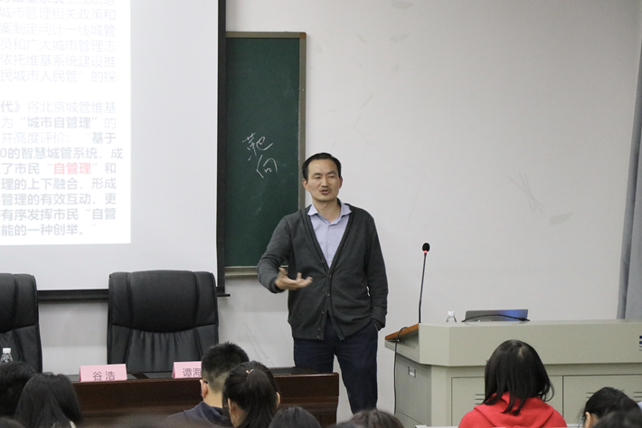谷浩博士以“西方城市治理的回顾与展望”为主题,围绕城市治理的定义、西方城市治理的主要发展历程以及未来展望等方面展开。谷浩博士讲授风趣幽默,他从西方学者对城市不同定义的分析出发,对自由经济主义时期一直到企业型政府时期的西方城市治理发展历程进行了回顾。最后,谷浩博士对未来城市治理进行展望,给我们展现了全球城市、全球城市网络的宏大图卷,表达了对过度城市化的忧虑,并以习主席“人民城市为人民”的理念为讲座作了一个圆满的结尾。