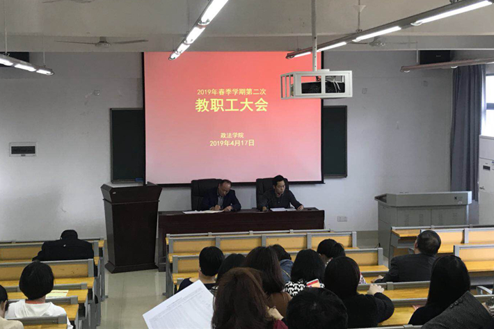 2019年4月17日,政法学院2019年度第二次全体教职工大会在博文楼南1105教室召开,40余名教职工参加会议。