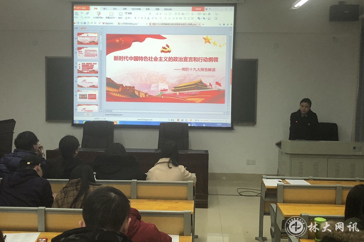 12月26日晚,政法学院党委邀请张家界市公安局禁毒支队副支队长、中央政法委、教育部“双千计划”互聘人员、政法学院院长助理卓曼丽同志为学生党员作党的十九大精神辅导报告。卓曼丽同志以“新时代中国特色社会主义的政治宣言和行动纲领”为主题,与学生党员分享自己学习党的十九大报告的学习体会。