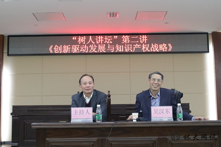 (文/政法学院) 11月21日晚,中南林业科技大学举行了“树人讲坛”第二讲。我国著名法学家、中南财经政法大学知识产权研究中心主任、原中南财经政法大学校长吴汉东教授应邀在文综楼模拟审判实验室举办了一场主题为“创新驱动发展与知识产权战略”的学术讲座。讲座由政法学院院长王飞跃教授主持,中南林业科技大学社科处处长蒋兰香教授和我校师生、省内其他高校师生以及法官、律师等近300人一起聆听了讲座。
