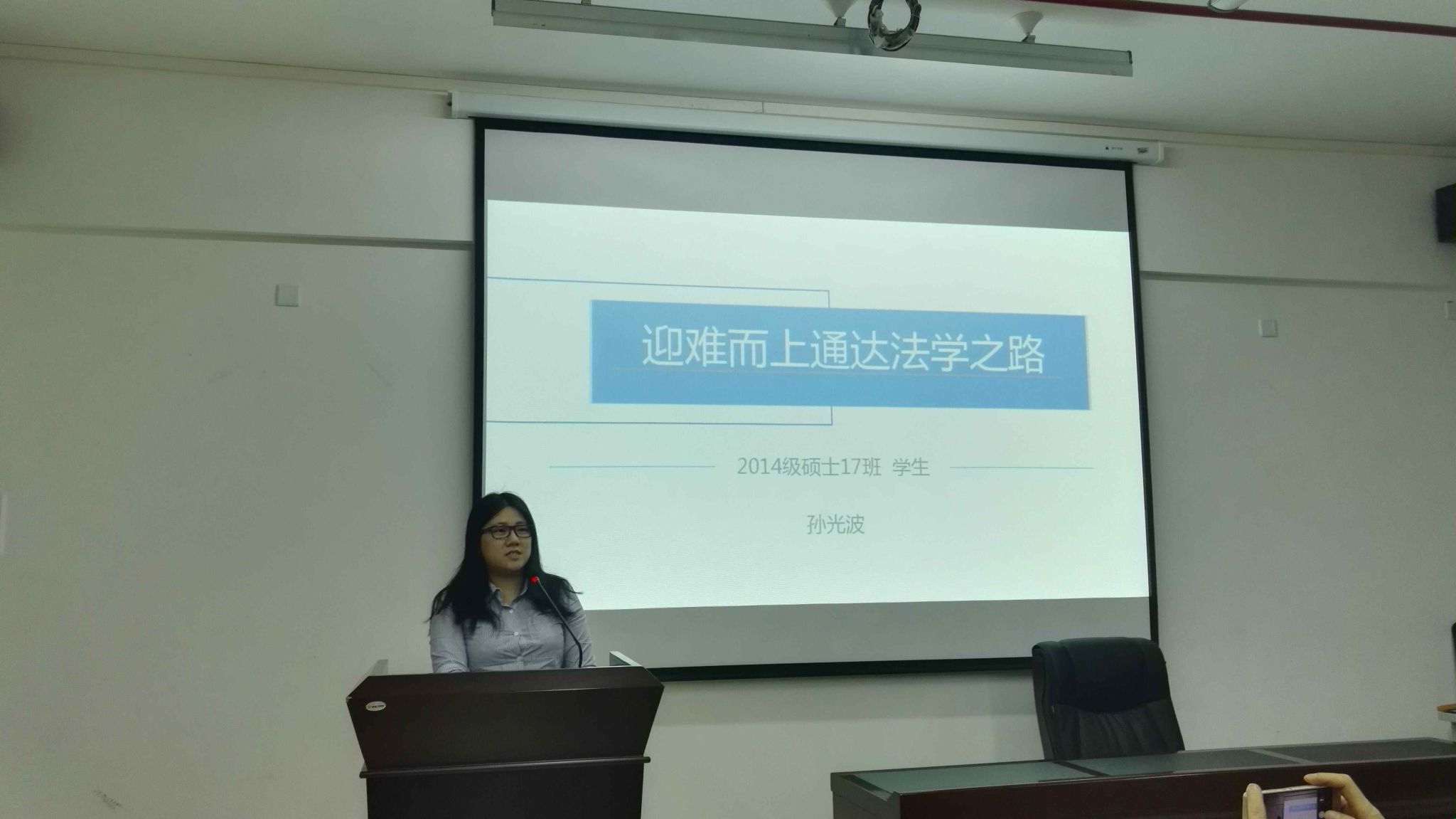 刘娟以“精彩人生路,法律伴我行”为主题和大家分享了自己读研期间的心得和感悟。刘娟在31岁那年毅然辞职考研,考取了我校法学专业的研究生。作为两个孩子的母亲一边有家庭要照顾,一边要应对课业的压力,她没有丝毫动摇,克服困难坚持学习。回忆复习司法考试那段时间的经历,刘娟笑称一个暑假几乎足不出户、埋头读书,人都胖了好多。功夫不负有心人,如今的刘娟不但顺利通过司法考试在知名律师事务所实习,而且获评省级优秀毕业研究生,为三年的研究生生涯画上圆满句号。她用亲身经历证明没有法学背景,年龄偏大等都不是真正的阻力,在法律职业的道路上有志者事竟成。
