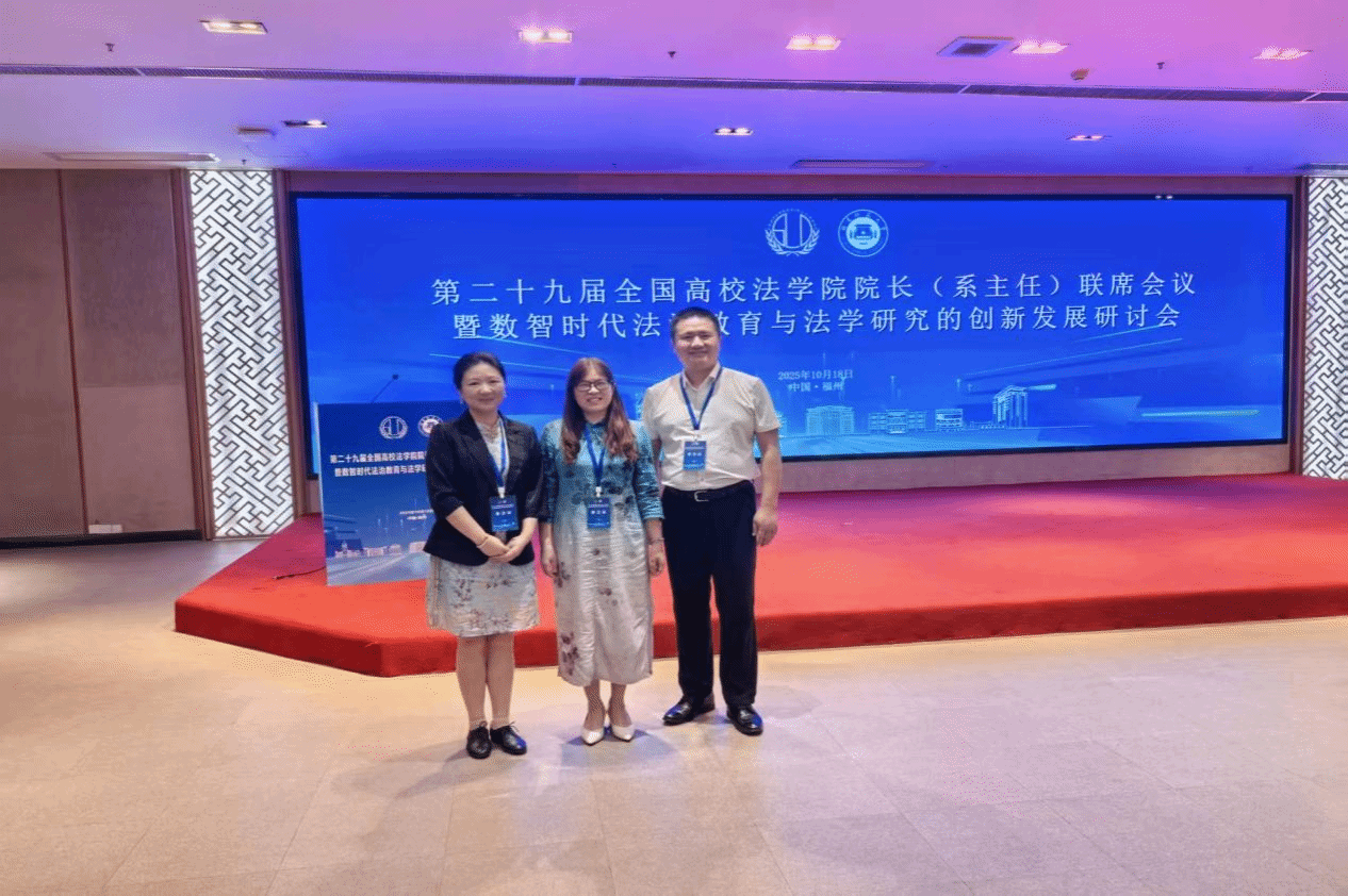 【法学院网讯 文/邓毅沣】2025年10月18日,第二十九届全国高校法学院院长(系主任)联席会议在福州隆重召开。本次会议由福建省师范大学法学院承办,法学教指委、法律硕士教指委专家,全国多所高校的法学院院长、专家学者以及多家企事业单位、实务部门的业界精英齐聚一堂,围绕“数智时代法治教育与法学研究的创新发展”议题,深入探讨在数字化、智能化浪潮下,法学教育面临的机遇、挑战与未来路径。我院副院长(主持工作)张小罗教授、法律系主任黄娟博士、知识产权系主任邓毅沣博士应邀出席本次盛会。