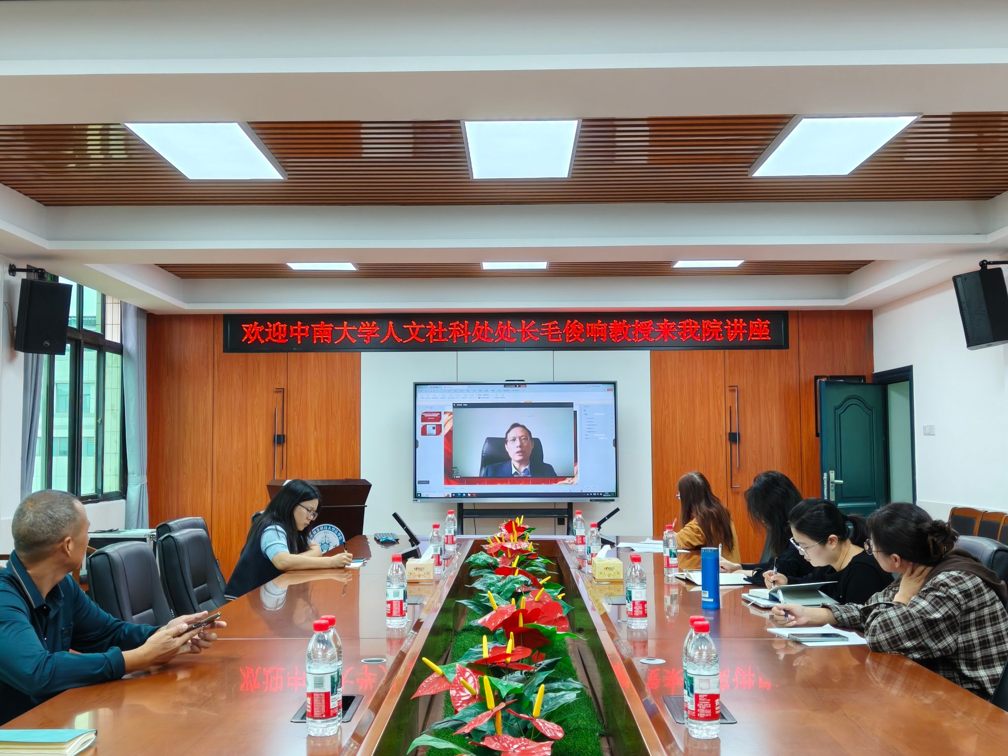 【法学院网讯 文/曹芳】近日,法学院组织了湖南省社科成果奖申报专家指导会。中南大学人文社科处处长毛俊响教授应邀线上出席并担任指导专家。法学院副院长(主持工作)张小罗教授、副院长曹芳副教授、社科成果奖申报人、科研骨干近20人以线下或线上方式参会。