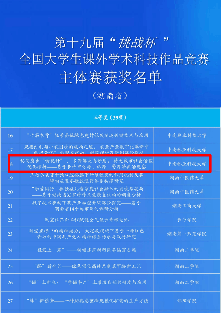 【法学院网讯 文/尹程苇】11月3日,第十九届“挑战杯”全国大学生课外学术科技作品竞赛在南京顺利闭幕。由我院法学专业牵头组建的“三源共治”竞赛团队,凭借《协同磨出“绣花针”、多源解决真矛盾:特大城市社会治理优化探析——基于长沙市访源、诉源、警源等共治观察》的调研作品,经过激烈角逐,一路攻坚克难,最终斩获全国三等奖!这是我校在本届主体赛事中赢得的三项最高奖励之一。也是法学专业近年来在该赛事中取得的最好成绩。