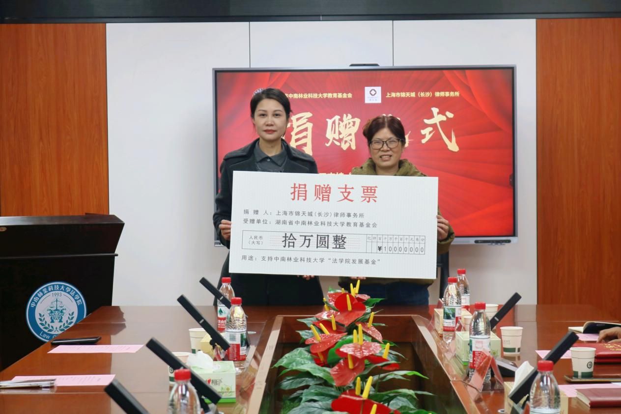 【法学院网讯 文/法学院】11月18日,上海市锦天城(长沙)律师事务所向我校教育基金会捐赠10万元用于支持法学院发展基金,以助力法学院在人才培养、学科建设及学术研究等方面的持续创新与发展。捐赠仪式在博明楼416会议室顺利举行。上海市锦天城(长沙)律师事务所宁洁主任一行、我校校友事务与发展联络处处长、教育基金会秘书长严爱军和法学院领导班子成员及部分教师代表参加仪式,捐赠仪式由法学院党委书记蔡洁主持。