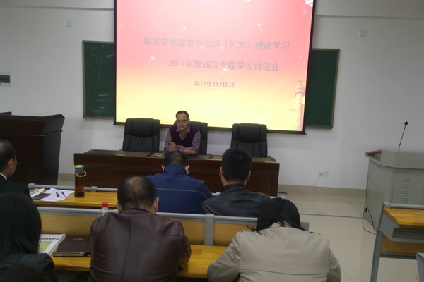 十九大,是我们党在全面建成小康社会决胜阶段召开的一次十分重要的大会,具有划时代的意义。11月8日下午,政法学院党委中心组在文科楼南1105举行学习(扩大)会议,深入学习贯彻党的十九大精神。学院党委成员、各党支部书记、教研室主任及部分党员代表参加学习。会议由学院党委副书记曾晓峰主持。