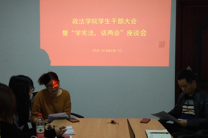 4月17日,政法学院于文综楼召开学生干部大会暨“学宪法,话两会”座谈会,组织学习国家宪法修正案和全国“两会”精神。政法学院党委副书记曾晓峰、宪法与行政法学科带头人张小罗教授、学生党支部书记及主要学生干部和党员参加会议。