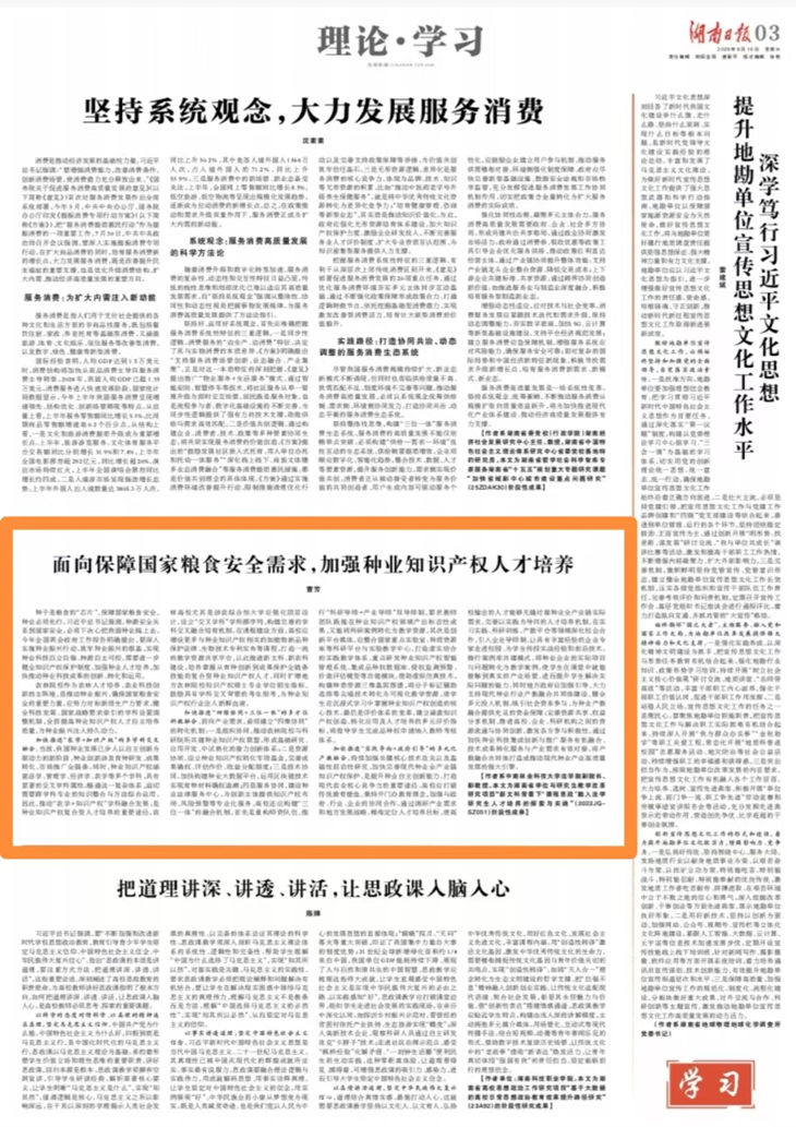 【法学院网讯】(文/曹芳)近日,副院长曹芳副教授在《湖南日报》理论版发表题为“面向保障国家粮食安全,加强种业知识产权人才培养”的理论文章。https://hnrb.hunantoday.cn/hnrb_epaper/html/2025-08/10/content_1749199.htm?div=-1。