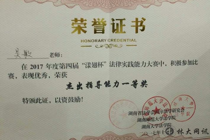 11月26日,由湖南省法学会程序法学研究会和湖南师范大学法学院、湖南大学法学院举办,长沙市冱涫程序法文化研究所承办,湖南师范大学漾翅法律实践团队协办的2017年第四届“漾翅杯”法律实践能力大赛在湖大和湖师大落幕。中南大学、湖南大学、湖南师范大学、江西财经大学等省内外众多高校参加竞赛,我校由政法学院2016级法学本科生组成代表队。经过激烈的赛场角逐,我校获得了团体二等奖的优异成绩,政法学院吴敏老师荣获杰出指导能力一等奖,2016级法学本科生刘杰、龚文捷同学分别荣获杰出诉讼能力二等奖及三等奖。
