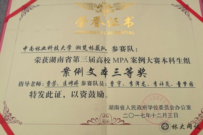 (文/政法学院 熊玲君 )12月3日,由湖南省人民政府学位委员会主办,湘潭大学承办,《中国行政管理》杂志社协办的湖南省第三届高校MPA案例大赛在湘潭大学落幕。全省共有13所高校的55支队伍参赛,分为本科生组和研究生组,设一等奖2项,二等奖4项,三等奖6项。我校政法学院2016级行政管理本科生李祎炅、童梦园、李泽龙、曹宇四位同学组队,在曹芳、匡娉婷老师的指导下撰写的《信用租房:无“信”不立时代租房模式的新变革》荣获本科生组三等奖。