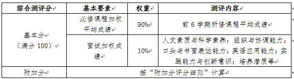 推免生综合测评指标体系见表1。综合测评分由基本分和附加分两部分组成,其中基本分又包括必修课程加权平均成绩和面试加权成绩两部分;附加分包括学生在各类学科竞赛、技术发明等活动中取得的成就和在文艺、体育及社会工作方面的特长等。