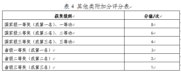 4、取得显著成绩的学校团委和学校学生会主要成员计2分;担任学院团委、学生会部长级以上干部一届以上的计1分,其他学生干部(含班干部)计0.5分。本项加分不累加,就高不就低。