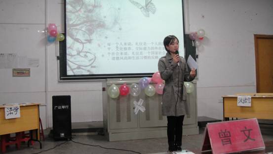 2010年10月25日19点整,由政法学院组织的文明礼仪知识竞赛悄然拉开了战幕,在西园经干二楼多媒体教室举行。