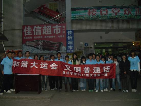 借大运会和谐之风,秉团建月文明精神,扬汉语言班级特色。2010年11月20日星期六下午17点,政法学院10级汉语言班全体同学在涉外食堂门前拉起“和谐大运会,文明普通话”的横幅,带头并邀请往来的行人在上签名支持“推普”行动。